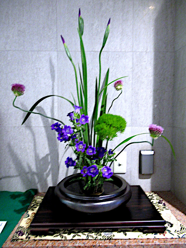 生け花ー菖蒲、アリアムリーキ、カンパニュラ、てまり層