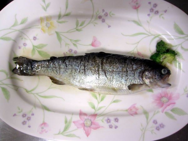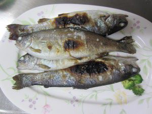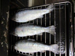 お弁当用に焼かれるニジマス(虹鱒 川魚は左向きに皿に盛り付けて