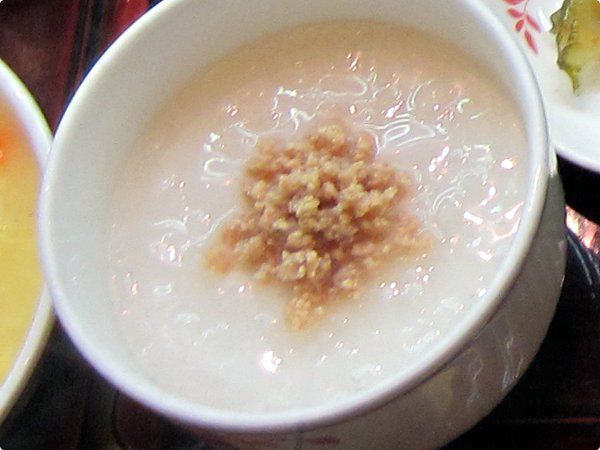 茶碗によそわれた紫米入りご飯+生姜と白胡麻ののトッピング