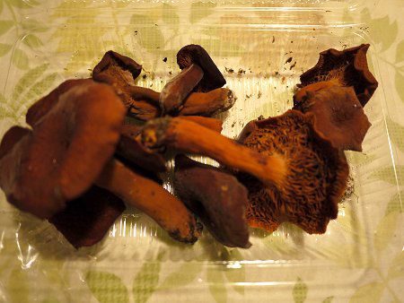 全体に赤っぽいキノコです。あるいは、冷凍されたからなのか?